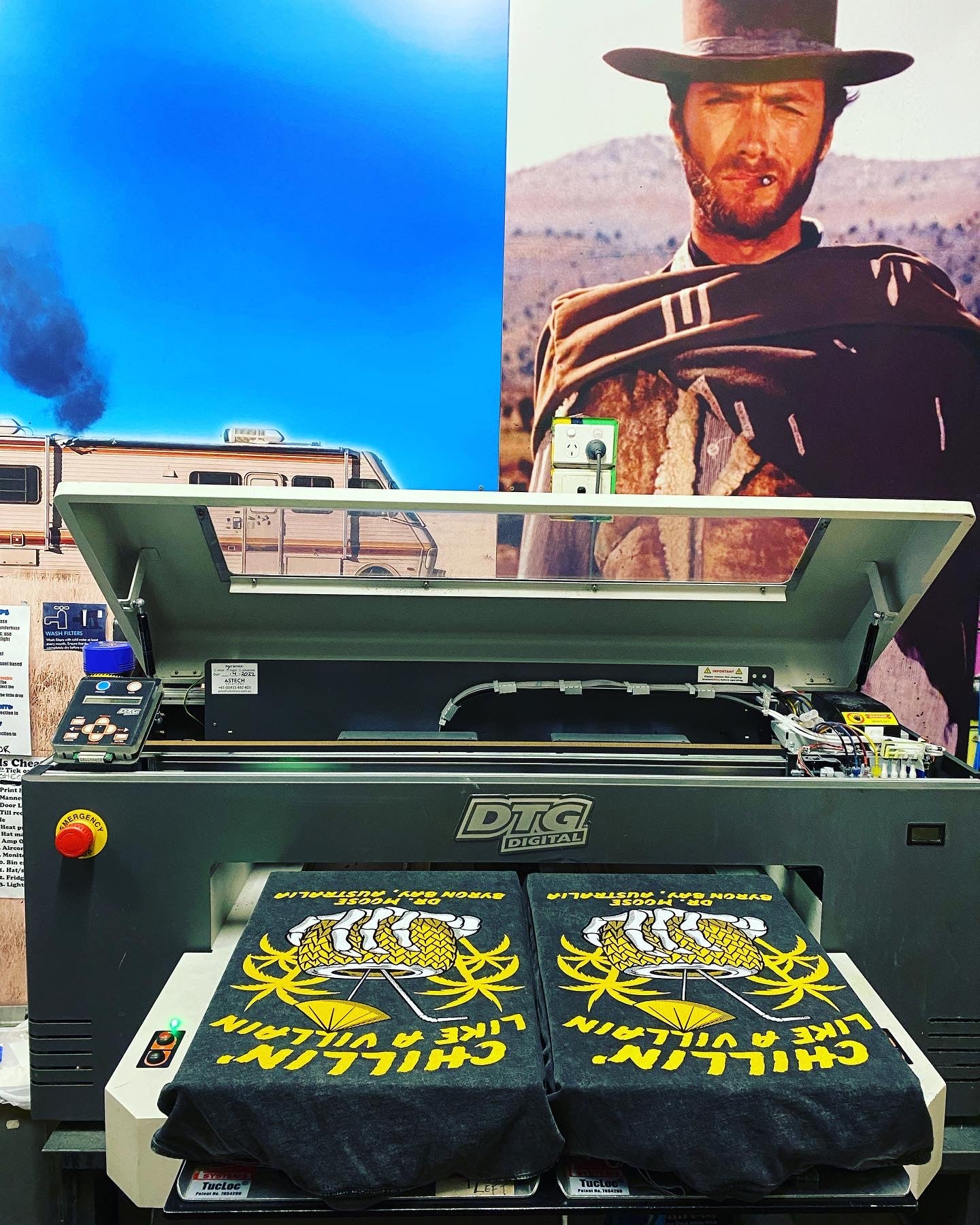 Here at Dr.Moose we print all of our products in house at our shop in Byron Bay, Australia. We use a DTG Direct-to-garment Printer, that allows us to print our shirts to order. This means minimal waste, no overstocking and no mass production items. Everything is printed by us, on location, and either hung up in our rack in store for customers to browse, or to be posted out for an online order.