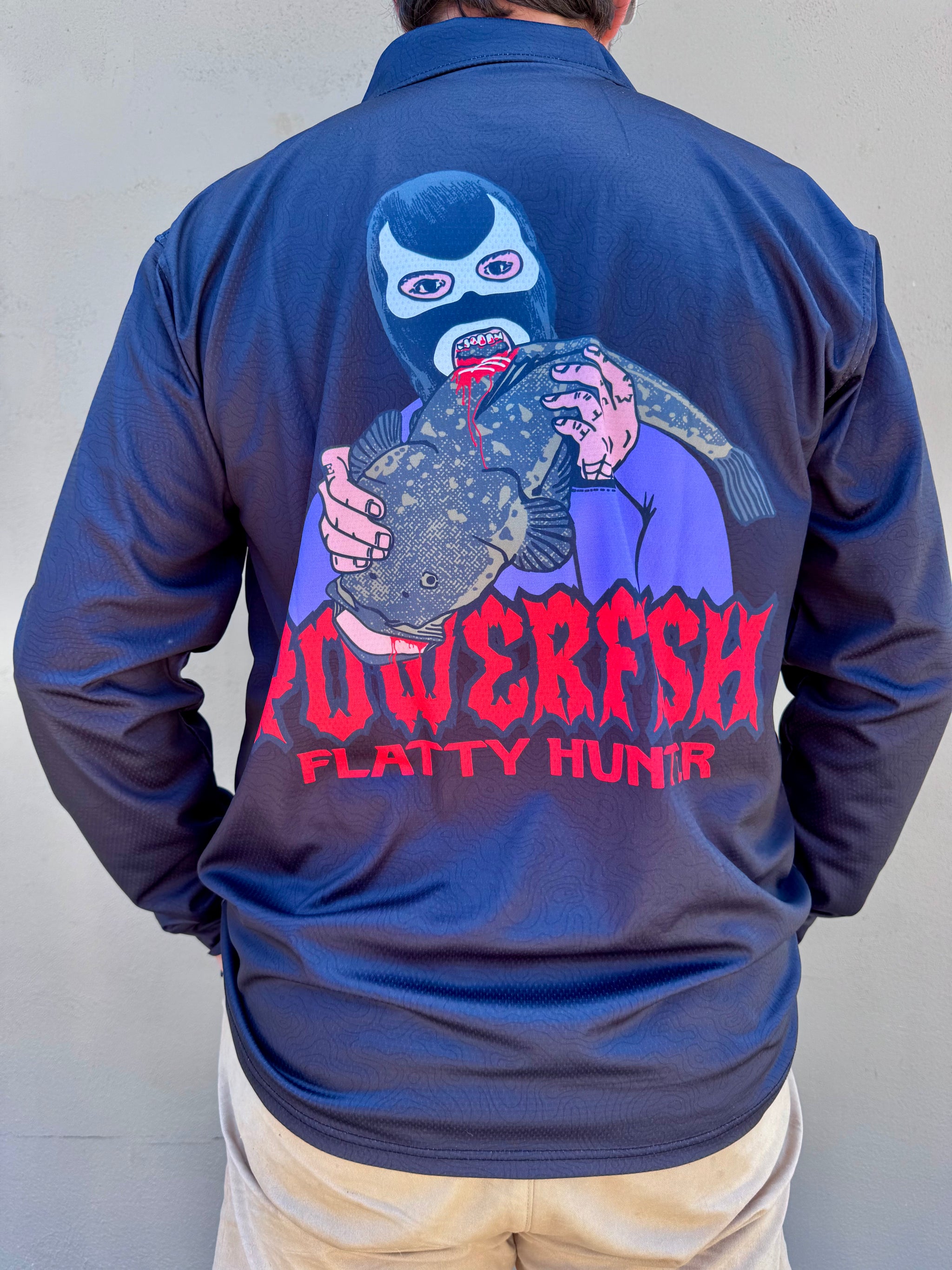The Powerfish Flatty Hunter Jersey is here and it’s pure carnage on fabric. A massive backprint of Powerfish chomping into a flathead with blood and guts spraying, plus Powerfish Flatty Hunter printed bold across the design. If you live for estuary mayhem, this is the ultimate flathead fishing jersey.